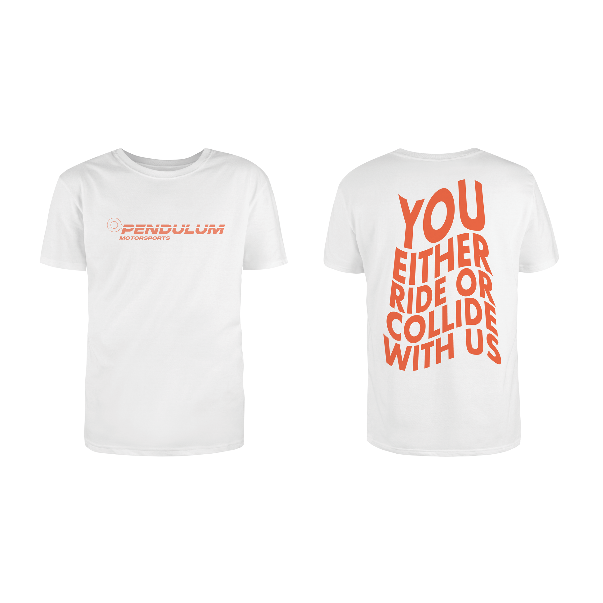 Fuel your passion for speed and style with the Pendulum Motorsports Collection—a tribute to the relentless spirit of the ride. This premium cotton T-shirt embodies the thrill of the road, featuring our bold coral slogan: “You Either Ride or Collide With Us.” Designed for those who live for the rush, this tee is more than just apparel—it’s a statement.