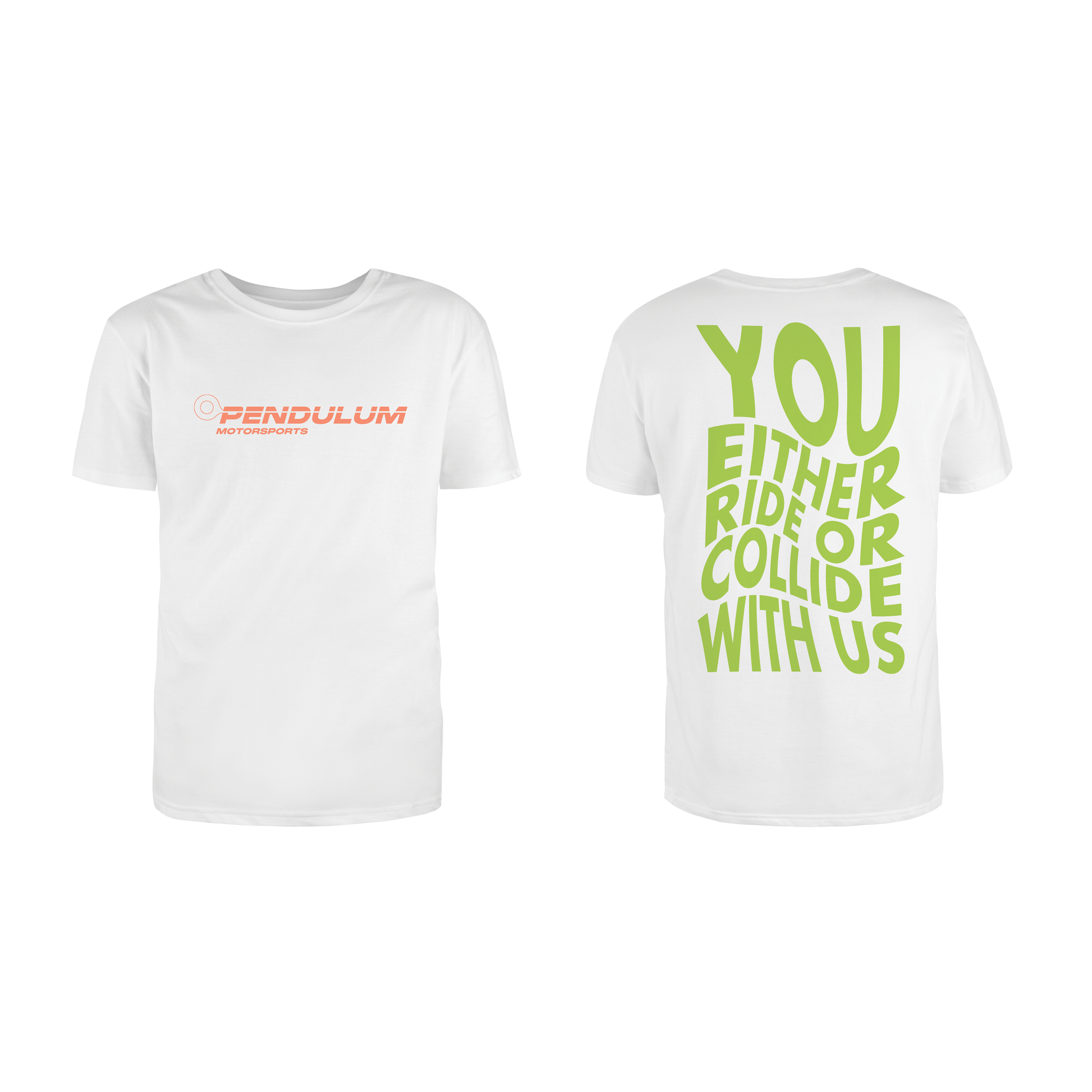 Fuel your passion for speed and style with the Pendulum Motorsports Collection—a tribute to the relentless spirit of the ride. This premium cotton T-shirt embodies the thrill of the road, featuring our bold green slogan: “You Either Ride or Collide With Us.” Designed for those who live for the rush, this tee is more than just apparel—it’s a statement.